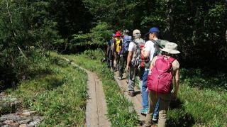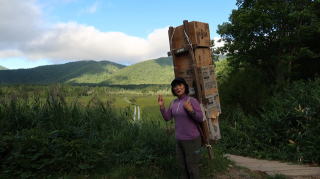 | ☆ ☆ ☆ 夕食後は小屋のスタッフから尾瀬の話を聞いたが、あくびをこらえるに必死でした。 いつもは30分くらいらしいが今回は1時間以上、元気なのは子供だけでした(^^ゞ ☆ ☆ ☆ 8日 東電小屋7:00…見晴8:00-20…ビューポイント9:50-55…山ノ鼻11:20-12:15…鳩待峠13:10 ☆ コースタイム 6時間10分 ☆ 出発前に歩荷さんなりきりの写真を交代で撮ります・ |