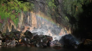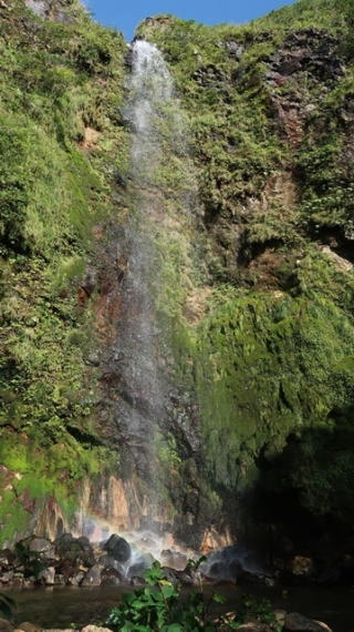 | ☆ ☆ ☆ 到着したのは落差36mの唐滝です。ここから全体が撮れると聞き、少し下りてパチリ 虹も見えてとてもキレイな滝でした。 ☆ ☆ ☆ |