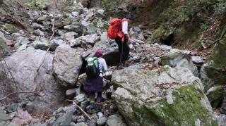 | ☆ ☆ ☆ 取りつきから少しすると、急坂の登りになった。怖かったが上だけ見ながら何とかクリアーしました。 本日一番の難所だそうです。次は大きな岩に捕まったり不安定なゴロ岩を歩いて行く。 すると今まで水が無かったのに、突然滝が見えた。って二人は見たようだが少ししてから その存在に気が付きました。急に現れた奥間滝、とても不思議です。 ☆ ☆ ☆ |