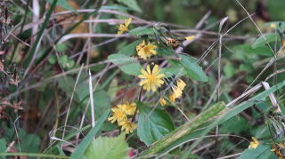 | ☆ ☆ ☆ 途中から鹿柵に沿って下っていきます。犬の吠える声が聞こえ人家が近くなってきたかな? 車道に出てから、数少ないお花を見ながら歩いて行きます。 ☆ ☆ ☆ |