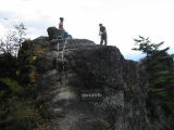 | ☆ ☆ ☆ 適度なアップダウン、数カ所の見晴らしは見応えがありました。紅葉は所々見えました。 妙義山は奇岩が多いのですね。妙な形に(@_@;)ナヌと思いました。 終盤で寄り道をして、10mくらいかな?クサリに捕まり岩を登ってきました。 一昨年はそこで足がすくんでしゃがみ込んでしまいましたが、今回はその先の天狗のひょうていまで行きたいな〜で登ってみました。狭いんです。絶壁なんです。近くにいた方にシャッターを押していただけますか?とお願いしました。 下がると落ちるよ〜なんて言われドッキドキの(*^.^*)vでした。 ☆ ☆ ☆ |