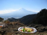 | この登山道は、山小屋まで物資を運ぶのにジープを使ってるみたいです。 タイヤの跡を見かけましたが、こぶや狭いと所は、車が走れるのかな?と思いました。 三ツ峠山荘に着くと目の前に雄大な富士山が現れました。うっわ〜きれい〜〜と思わず声が出てしまいます。 ちょと場所を替えてお食事タイムにしました。うん 美味しい♪ |