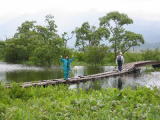 | 18日早朝雨がやむ気配がありません。お湯を沸かしアルファー米の五目ご飯にお湯を注ぎます。 待つこと20分。その間にコーヒーを沸かして飲みました。朝の一杯はおいしいなぁ(∩.∩) お腹も満たされ雨も小休止のようです。さっ 今日こそニッコウキスゲを見ようと原に向かいます。 あれ〜見あたらないんです。6月に霜が降りたので花はほぼ全滅と聞きました( _ _)ガクッ 大堀橋先では木道が冠水して水が膝上までだって(;^_^A ツアーの女性達は元気でした。 どうぞと写真も快く撮らせてくれました。普段見られない尾瀬を見ることが出来ました♪ ちょうこさん・パパさんお疲れ様でした(=^0^=)/ |