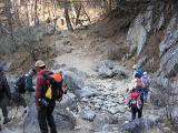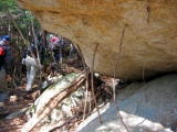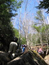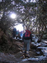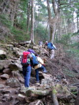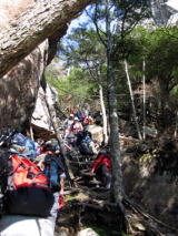 そして登りも終盤になります。いよいよ問題の滑る場所に来ました。確かに雪がうっすらとして凍っています。 ここはロープが垂れ下がり、丸太の節に足をかけながらの上り下りになります。 降りる人を優先に待ってましたが、とぎれそうになると次のグループが来ます。