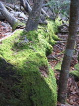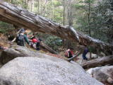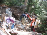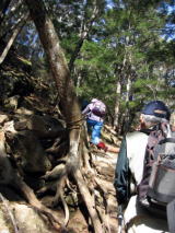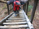 しばらくするとロープをつかんで岩を登ります。巻道はありますが、倒木をまたがないとね。 そして丸太の階段がありました。下が見えるので、怖さが有るかな〜