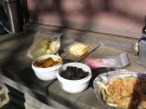 雪の無いところでお昼の準備です。いつもの鍋焼きと煮豆にかぼちゃの煮つけにetc♪