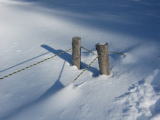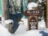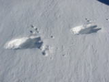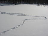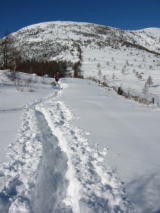 | ☆ ☆ ☆ 鐘の場所で記念写真を撮り、キャンプ場経由で駐車場まで降りていきます。 日に当たった雪はキラキラととても綺麗です。 動物の足跡もありましたが、蛇行してるのでキツネが獲物でも探しながら移動したのかな?との話になりました。 ここでも新しい道を作ってみました。踏み跡がないと雪が重いけど結構楽しいです♪ ☆ ☆ ☆ |