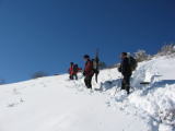 | ☆ ☆ ☆ さて山頂へと向かいます。二日前に下見をしたシゲさんの話によるとトレースがないと大変だと言ってました。 何が?と歩いていくと結構雪が積もってます。途中ですれ違った男性が登った時はトレースが無かったそうです。 トレースがあったので男性4名はホッとしたことでしょう。無かったら交替でラッセルをするところでした。 掃部ヶ岳でその大変さは体験済みです。すれ違った男性に感謝ですね。 ☆ ☆ ☆ |