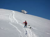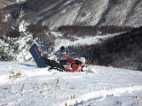 | ☆ ☆ ☆ 下山の時間になりました。 みなまるさんが滑降したいとボードをかついできたのですが、新雪でのすべりを見せていただく事に… 結果はここで暴露するとまずいかな〜(^^;; ☆ 下山は道でない新雪も歩いてみました。大分沈みますがとても楽しいです。 そして雪道では滑って尻餅をついた人が多かったな〜。 人のこけたのを楽しんで見ていたら、わたしもおしりでツツ〜と滑ってしまったのでした。これも楽しいものですね。 ☆ ☆ ☆ |