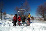 | ☆ ☆ ☆ 駐車場からリフト(500円)に乗り出発します。リフトに乗り込むと呼ぶ声が聞こえました。 先に現地入りしていたみなまるさんでした。上で待ってますと伝えリフトから降りると…あれ?サングラスが無い(^^;; 上ってきたみなまるさんにボードで車まで行っていただき取ってきてもらいました。時間のロスで皆さんにご迷惑をかけました。 ☆ ☆ ☆ |