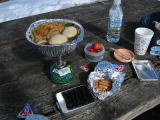 | 富士山やまわりの山を眺めながらのランチタイム‥美味しいですね。 山頂では数組のグループを見かけましたが、少し下の浅間休憩所に降りてビックリ 小屋やベンチは人で埋め尽くされていました。 上まで行けば眺めが良いのにって思いましたけどね。 |