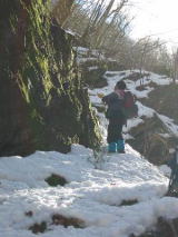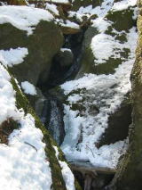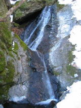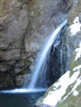 | だんだん雪が増えていきます。そして苦手な沢を幾度となく渡ります。 水音だけの世界、沢や小滝を眺めながら素敵ね〜と足を止めます。 間の滝をパチリ。ワンちゃんも一緒にパチリ♪ |