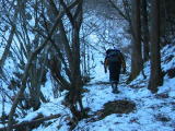 | そして下りの最大の難所に来ました。みなまるさんが前もって設置したロープで鳶八さんが進みます。 所が、横歩きのロープは間に合ってましたが、下り斜面用のロープが無いと降りられない‥ 鳶八さんがロープを追加してましたが少し足りません。 大丈夫と言ってましたが、ロープを放してからの様子を食い入るように見てました。 σ(o^_^o)は二番手なもので‥。そして怖いな〜と思いましたが進まないと帰れない。 ロープを伝わって横歩き。これは大丈夫。そして下り用のロープを手に巻き付けながら慎重におります。 鳶八さんからは、もう少し左、その根っこを掴んでと みなまるさんからは、怖かったらジットしていてとの声が聞こえます。 木の根に捕まり慎重に降りました。ホッと出来るところまで到着(^.^;ふ〜〜〜〜 腕がプルプル震えていました。 |