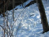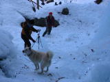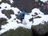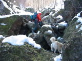 | そして最大の難所に来ました。左の斜面は危険なので沢沿いを登ります。 所が一箇所σ(o^_^o)の足が届かない。沢が深くて進めない・・長靴なら難なく進めそうでしたが・・・ 鳶八さんが上から岩を落とし、水の中に手を入れて足場を作ろうとして下さいました。 でも深くてだめ・・そして最後の手段でσ(o^_^o)を渡す運びになりました。 鳶八さん、ご迷惑をおかけしました。 ☆ その時みなまるさんは左斜面を登り、帰りの為にロープを設置します。 雪があるため手間取っていたようです。お疲れさま。 そんな事を察知してかワンちゃんはそちらをジット見つめていました。(^.^;だったような |