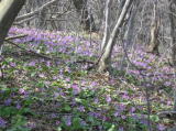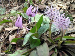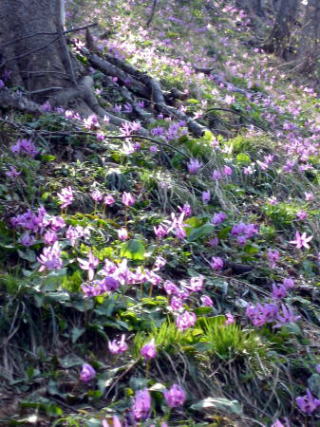 | ☆ 前半はオオミスミソウをたくさん見かけました。 あそこにも、ここにもと、宝探しのようにはしゃいでしまいます。 お花の色も白・青・ピンクと色とりどりでした。 ☆ そして、今回の楽しみの一つ、カタクリのお花達を見ることです。 期待以上の群落を見ることが出来ました(^^)v ☆ |