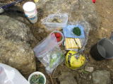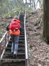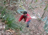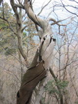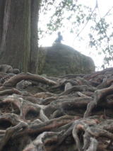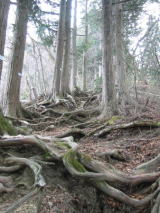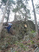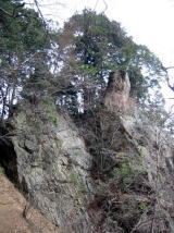 | ☆ そして天狗岩に到着です。 あぶさんが、クサリがありますよ。と教えて下さいました。 σ(o^_^o)=クサリ好きがなぜか定着しています。 それほどでもないんですけどねぇ(^^;; 岩は木の根が張り出していました。 捕まって登っていくと、天狗の像が見えます。 ☆ |
