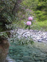 | ☆ 雁坂トンネル手前では霧で視界が悪く…o(;-_-;)oドキドキ! ノロノロダンプの追越をかけたら対向車が来て…o(;-_-;)oドキドキ! ☆ みなまる号とつるんで、みとみ道の駅に4時30分に到着しました。 あぶさんから温かいコーヒーをご馳走になり、金さんとは久しぶりに会いました。 一緒に行きませんか?と皆さんに言われてましたが、風邪で調子が悪いとの事。 見送りされて、出発することになりました。 ☆ 西沢渓谷駐車場へと移動します。 身支度をしていると、「あっ靴を忘れた。替えのソールはあるけど。」 なんて笑い声が聞こえます。誰だか分かりますよね(^^;; ☆ 二股の橋を渡り、進入禁止から東沢へと向かいます。 まだ早いと思っていた石楠花が綺麗に咲いていました。川の水もとても綺麗です。 ☆ |