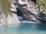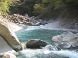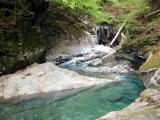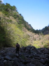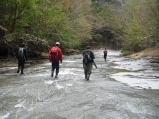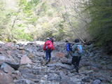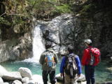 | ☆ 開放感のある川原を歩いていきます。 そして崩れかけてる山道を登り、一気に下るとほら貝へ到着。 キレイ〜〜が第一声でした♪そこで撮影タイムです。 ☆ また悪路の急坂を登ります。同じ道を登ってるのかと思ったら違うんですね。 って事は帰りもここを歩くのねとギクリとしてしまいます。 ふーふ〜息が切れます。 山ノ神を過ぎて沢歩きが始まります。 ☆ 「ここからは濡れるのを覚悟してください。」とみなまるさんから… 流れの中の石って状態が分からないので、みなまるさん頼りでついていきます。 ついていくことによって足使いがなんとなく分かり 自分でも驚くほどのスピードで歩けました。 ってか置いていかれたら困るが本音です。 ☆ |