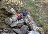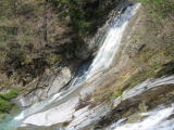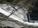 | ☆ 幾度となく沢を渡り、不安定な石にこわごわしながら進んでいくと魚留の滝に到着。 どこを登っていくのかな?と眺めていたら流木が立てかけてあります。 のじやんの置き土産のようです♪ あそこに足をかければ大丈夫なんて声が聞こえますが、σ(o^_^o)には届かないぞ〜 みなまるさんにお助けロープを架けていただき、何とかクリアー(^^;; ☆ |