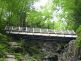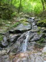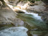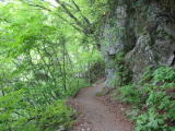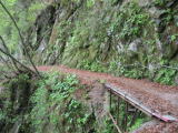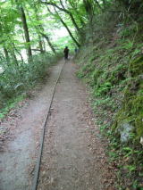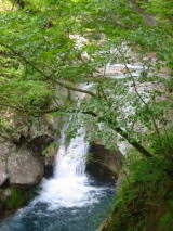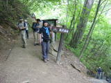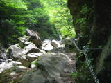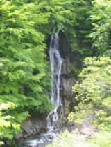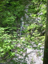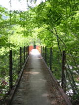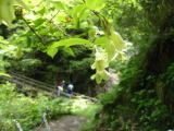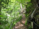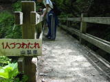 | ☆ 一人づつわたれの橋を渡ると、メインの七ツ釜五段の滝はすぐそこ♪ ところが3名の人が沢を覗き込んで渡ってくれません。 どうぞと言わんばかりに道を空けてますが、定員オーバーを見過ごすわけにもね。 後ろから人が来ましたが、3人が察してくれるのを待ってました。 ☆ |