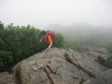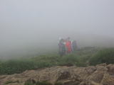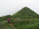 | ☆ 5時20分降りそうですね。と出発します。樹林帯は薄暗く 同じような急坂が延々と続きます。時々滝の音が聞こえますが、ガスって見えません。 雨音がする?…いよいよ降ってきたのかな〜と諦めムードでしたが 木の葉についた露が風で落ちてきた音でした。 ☆ 樹林帯の長い急坂を抜けると、岩場に出ます。 登れるかな〜とふと上を見たら、クサリが見えました(^^)v ☆ |