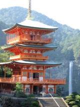 少し歩いていくと、朱色の塔と先ほどの那智の滝が見えました。
