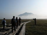 | ☆ 早朝の尾瀬ヶ原は朝霧に包まれ幻想的な姿を見せてくれました。 とても静寂で露に濡れたクモの巣、草もきれいです。 ☆ 牛首分岐からは東電小屋に向かいます。この間もきれいな眺めです。 燧ケ岳のシルエットが良いですね。地塘は波もなく静寂さが伝わってきます。 ☆ |
