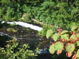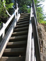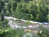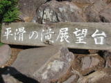 | ☆ さて滝に向かいましょう。この先からは木道がなくなり登山道らしくなってきました。 しばらく歩くと丸太で出来た急な階段が現れました。滑らないように慎重に降ります。 ここで水の流れが大きく聞こえてきます。「平滑の滝」に到着です。 ☆ |