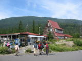 | ☆ 山頂まであと5分。ここまで登ると嬉しいですね。 まもなくヒュッテに到着。お土産は後でと先に見える山頂を目指します。 ヒュッテの裏手には風力発電?が見えました。 ゴロゴロした岩を歩いていくと山頂です。 山頂は青空が見えたと思ったら直ぐ視界がなくなります。 山のお天気は変わりやすいですね。 ☆ |