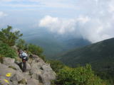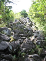 | ☆ 出だしは狭い急坂でしたが、その後蓼科山荘まではなだらかな道です。 山荘前で休んでいると若い人たちが記念写真を撮るたび賑やかでした。 元気だね〜と思うと同時に若い山人口にニンマリ♪ ☆ ここから山頂まで30分ですが、大岩の急登をいっきに登ります。 息を整えるため振り向いて前掛山や町並みを眺めます。キレイキレイ♪ ☆ |