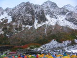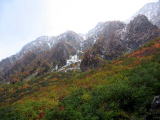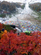 涸沢ヒュッテに到着しました。紅葉が鮮やかで綺麗です。穂高もガスリながらも見えます。