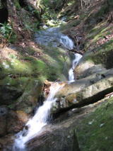 | ☆ ☆ ☆ 湯峯温泉宿を通過します。やっと人の気配を感じるようになりました。 「湯峯王子」を見ましょうと歩いていくと、不動滝の看板がありました。 どうしょうかと悩みましたが、10分で着くらしいので寄り道をします。 苔の沢沿いを歩いていきますが、ナメがとても綺麗です。ナメ歩きをしたいなって思ったりして… チョット急坂を登ると不動滝に着きました。良い感じの流れです。下のほうには虹も見えました。 ☆ ☆ ☆ |