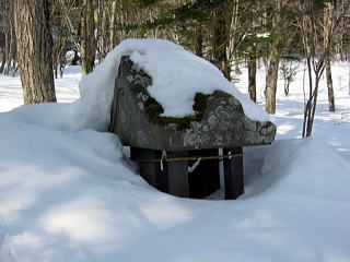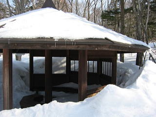 左手に雪の重みでつぶれそうな東屋がありました。好奇心で中に入ってみました。雪のすきまから光が入りチョット不思議な気分です。