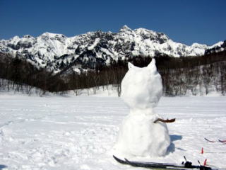 広いひろい鏡池に到着しました。中央には可愛い雪ダルマのお出迎えと、この時期限定 古木に触れることが出来ました。