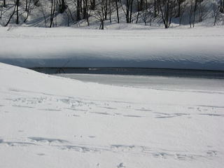 一ヶ所だけ氷が融けている場所があります。興味津々でしたが、近寄ったら危険ですよね。