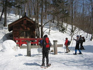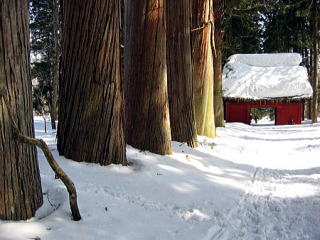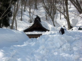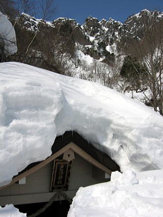 奥社近くに到着しました。雪が多いのですね。雪下ろしをしているので近くを通過するのは悪いかな?で尋ねてみました。