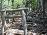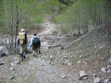 ひえ〜 ここも渡るのね。木の棒を見つけて、渡ります。ロープの張られた所もあり慎重に渡ります。