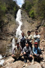滝をバックに集合写真を撮ることになりました。まずは全員で。