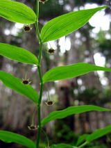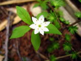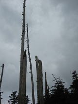 | ☆ ☆ ☆ 三叉峰まで着きました。あとは下るのみ、ダブルストックを出します。 膝への負担が大分違いますね。 ☆ 枯木帯からは雲が厚くなってきました。下山時でよかった。 タケシマランのお花を見つけましたが、薄暗いのでピントが合いません。 ☆ ☆ ☆ |