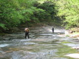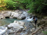 | ☆ ☆ ☆ あった〜。まだ先にも有りますよの言葉に気持ちはルンルンです。 ところが、登りが大変です。ヘーヘーしてお腹も空いてきました。 上のほうに見える、4段ナメ滝の上で休めるようなので、そこまで登ります。 ☆ やっとお食事タイム♪ビールなんて持ってきたので乾杯(^^;; ☆ あとは山頂まで目指します。水の流れてない所を登ろうとしたのですが、返って滑りやすいのです。 足元は気にせずジャブジャブ。足のとどかない場所は岩にしっかりとつかまり、膝も使いながら登ります。 お助けロープを差し出されましたが、トライしてダメな所意外は出来るだけ自力でと… でも落ちたらアウトです。 ☆ ☆ ☆ |