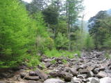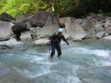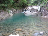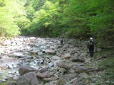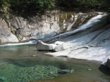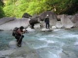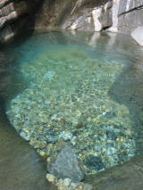 | ☆ ☆ ☆ 道の駅に到着すると、すでにふたつぎさんは待ってました。 少し雑談をし、西沢渓谷の駐車場に移動します。 ここで10名くらいのパーティが準備運動を始めて、出発するところでした。 あれ?なんであちらに行くのかなぁ。道があったかな? 支度が出来たので出発します。帰りはここの登山口に降りてきますと聞きながら通過します。 ☆ 警告のお知らせ板から入り,すぐ河原に降ります。 少し歩いて行くと、とんでもない斜面から数名が降りてくるのが見えました。 あら?駐車場で見た、団体さんのようです。手間取ってる様に見えるけど大丈夫なのかな〜と思いながら進みました。 ☆ 数回徒渉し巻き道を登ります。降りると「ほら貝」に着きました。 ここのお水は綺麗な色をしています。去年も気になりましたが、奥はどうなってるのかな〜と… でも泳いで行かないと分からないので、よけいな事は言いませんでした。 言ったら、泳いでなんて言われそうなので…(^^;; ☆ ☆ ☆ |