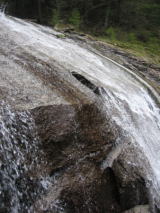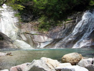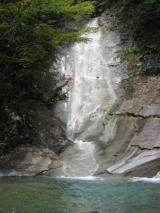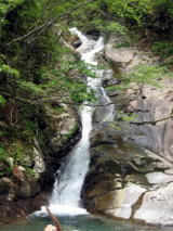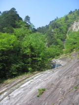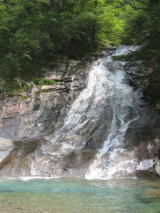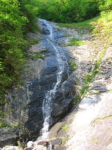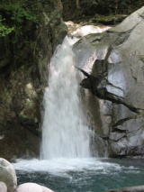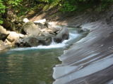 | ☆ ☆ ☆ それほどしないで、乙女の滝に着きます。これも早く着いたように感じました。 そしてあの、滑りやすい東のナメ滝に着きました。 今年はチョット上まで登りましょうと歩いていくと、ツルッと滑る〜 降りる方が怖いな〜。座って手をつきながら、つつーっと…楽しいです♪ ☆ ☆ ☆ |