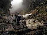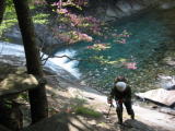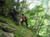 | ☆ ☆ ☆ そうこうと進んでいくと、魚止滝に着きます。 去年より水量は多いかな〜。左手を見るとあのときの木が無くなっています。 あれが無いと巻けないのだけど…みなまるさんにルート工作をして頂きました。 その間シャクナゲがあるとキョロキョロとしてました。 ☆ ロープを設置して頂き、まず登ります。この先が妙に緊張したのを覚えています。 あと一歩が届かないんですよね。短めのロープを借りなんとかクリアー 所がその後チョト油断したら、ツツーと滑ってしまいました。 あら止まるのかな〜と不安になりました。このまま止まらなかったら 魚止滝のダイブになってしまいます。そしたらまた登らなくちゃだわ(^_^; ☆ ☆ ☆ |