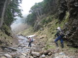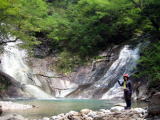 | ☆ ☆ ☆ 滝の右手を巻いて、登っていきます。ここも危険なのでみなまるさんに ルート工作をしていただきます。ふー。ヤゲンの滝に着きました。 ここまでは、見たことがあるのでやった〜の気持ちで一杯です。 ☆ ☆ ☆ |