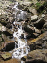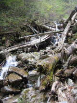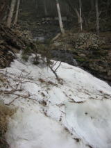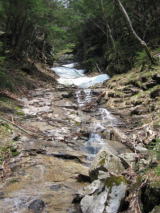 | ☆ ☆ ☆ 山頂はまだなの?と見上げると、残雪が見えます。まだまだかな〜 ☆ 残雪を横目に通過すると、心なしか水音が聞こえます。 やっと水場に着きました。冷たいお水で顔を洗います。 ここで小屋から降りてきた登山者はっけ〜ん。向こうも驚いたようです。 まさか下から人が登ってくるなんて思ってもいなかったようなので… ☆ ☆ ☆ |