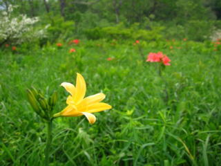 | ☆ ☆ ☆ ヨッピ橋から牛首方面へ向かいます。この辺りにある地塘は雲や青空を映し出しとてもよい感じです。 去年はここにニッコウキスゲの群生があったけどと、右手を見たら一花だけ咲いていました。ラッキーでした。 ☆ ☆ ☆ |