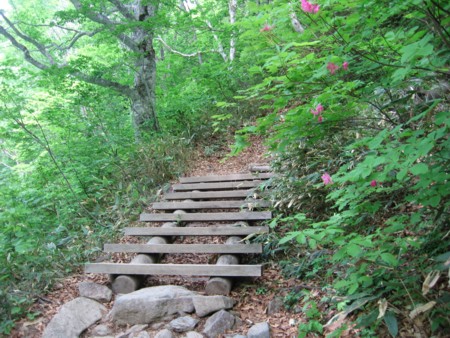 ☆ ☆ ☆ 登山口からしばらく沢沿いを歩きます。涼しい。 そして、木道・階段・石段と登って行きます。