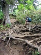 木の根はは凄いです。登るとまた木道歩きです。ちょっと撮ってとポーズをとりますが、安定しません。 ☆ ☆ ☆ |
