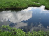 地塘の水辺に写る青空と雲が綺麗で、見ていると心が洗われる思いです。