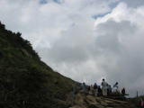 あと少しで、山頂です。人が大勢いるのが見えます。山頂には座るところがないかもしれない… 到着しました。ツアーの人達が、班ごとに記念写真を撮ってます。 これはいなくなるまで待たないと…ちょうど岩陰から出た人がいたので